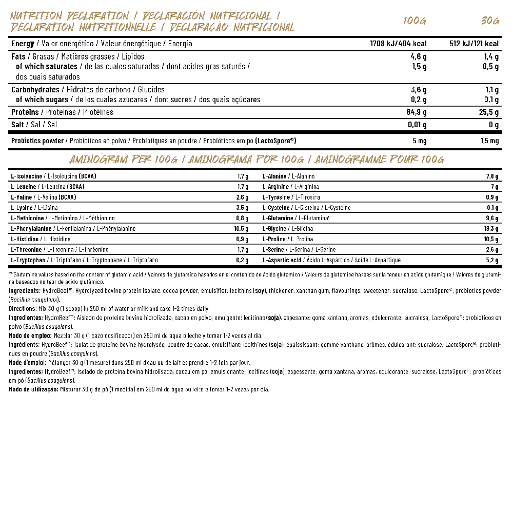 HydroBeef™: isolado de proteína bovina hidrolisada, cacau em pó, aromatizantes, emulsificante: lecitinas (soja), espessante: goma xantana, adoçante: sucralose, LactoSpore®: pó probiótico (Bacillus coagulans).