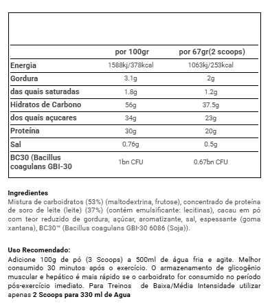 Adicione 100g de pó (3 scoops) a 500ml de água fria e agite. Melhor consumido 30 minutos após o exercício. O armazenamento de glicogênio muscular e hepático é mais rápido se o carboidrato for consumido no período pós-exercício imediato.Para Treinos de Baixa/Média Intensidade utilizar apenas 2 Scoops para 330 ml de Agua.